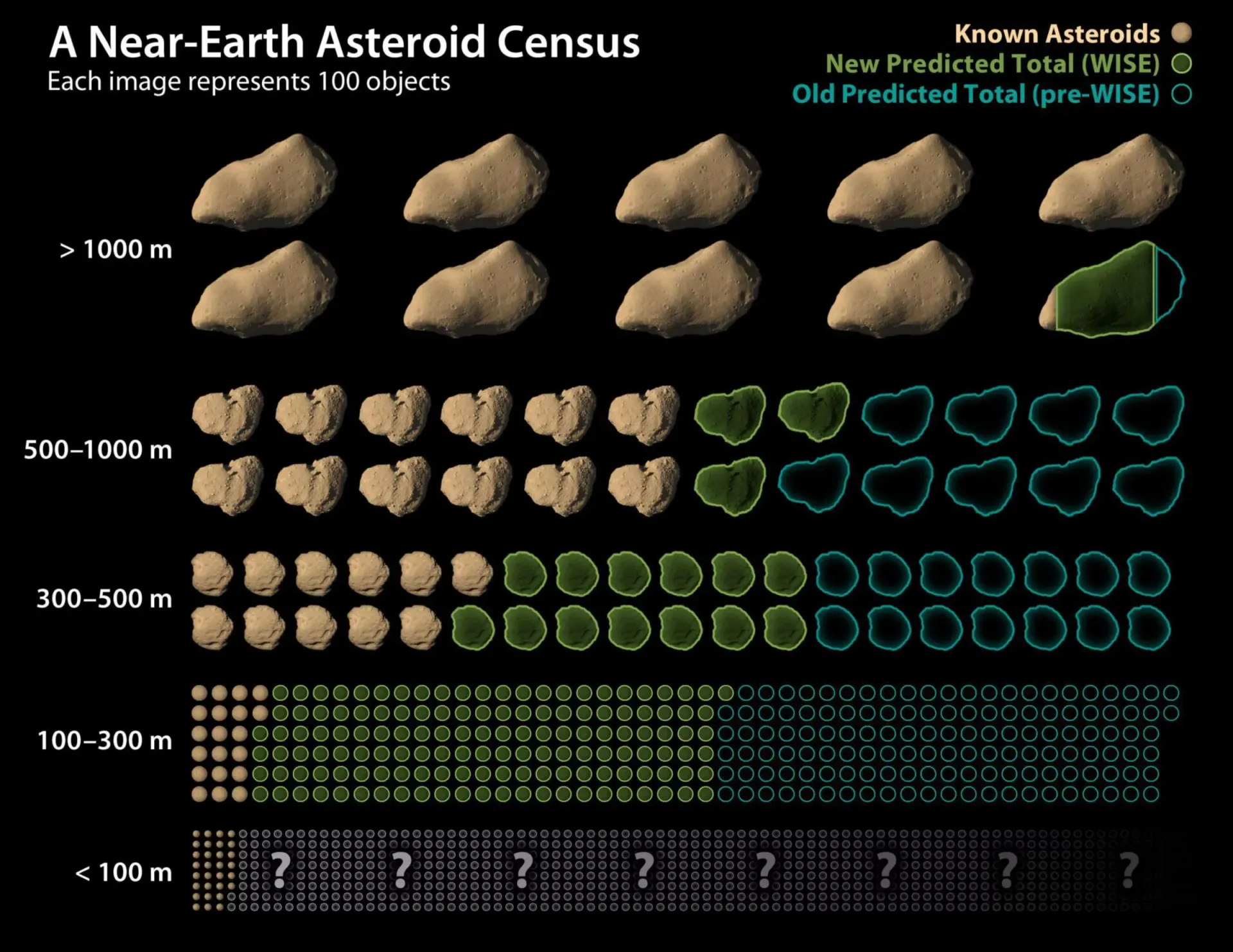Il progetto NEOWISE, utilizzando WISE, ha condotto un'indagine per catalogare le diverse dimensioni. Ha osservato numerosi asteroidi, a partire dai più grandi, i.e. 1000m, fino ai più piccoli, i.e., 100m, con solo qualche incertezza trascurabile sulla stima.