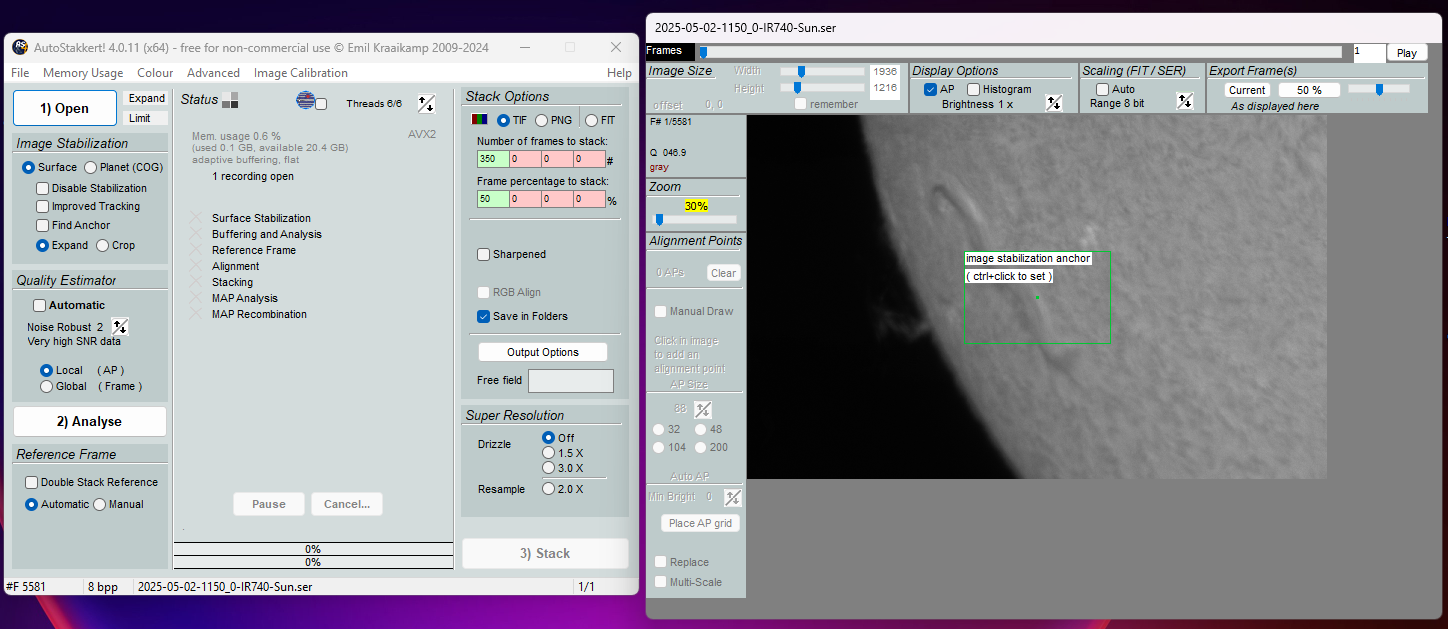 Una volta effettuata la ripresa è il momento di dare in pasto il nostro filmato a un software di stacking delle immagini. Il software analizza il filmato e successivamente, attraverso punti di contrasto impila le immagini migliori, scartando le peggiori. Questa fase è determinante per l’ottenimento di un file grezzo, che successivamente sarà elaborato.